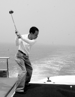 面对蔚蓝色的大海,在豪华游艇上,如何打高尔夫?那是一种什么感觉?“小白球打出去,飘在海面上,艇再开过去,用网捡上来。”游艇上服务员还没介绍完,有6年打球经验的高尔夫球手陈先生就抢着说:“那就是一个字:爽!”陈先生昨日作为贵宾试乘时,第一次在游艇上打高尔夫,“环境特殊,感觉也好极了,海上视野宽阔,球在海上落水和在岸上落地感觉也是完全不同的!”