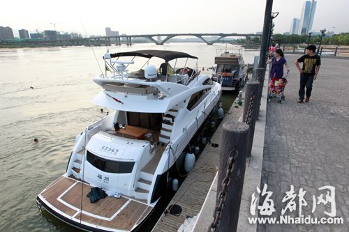 在福州闽江尤溪洲北桥头的华龙龙园码头,停靠着多艘游艇,引来不少前来游泳的市民的关注。“听说一艘上千万呢”,在闽江公园巡逻的保安告诉记者,几艘船停靠有一段时间了,而在码头旁边的一艘船是当天下午刚停靠上去的。